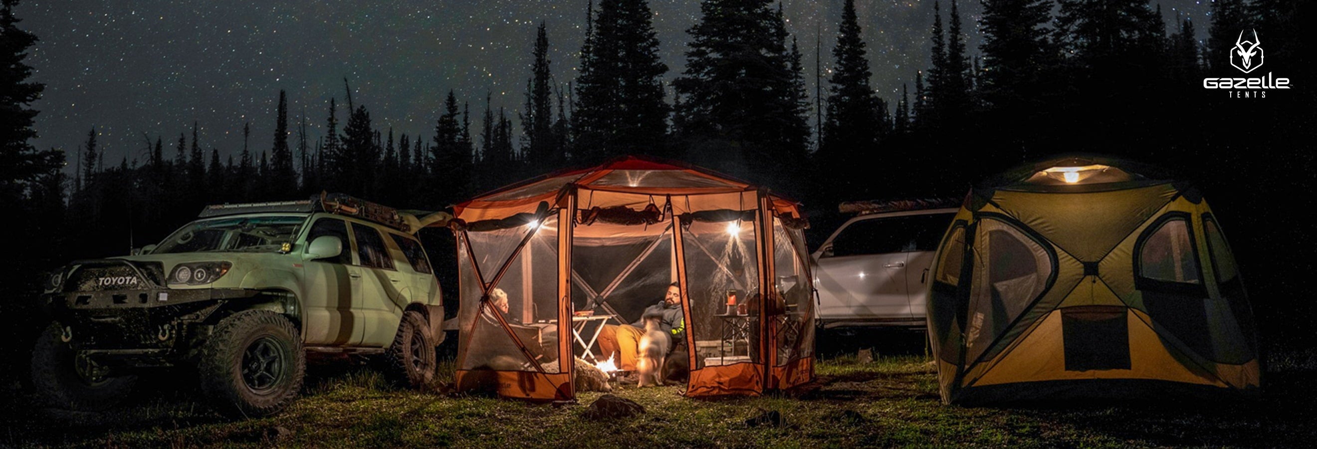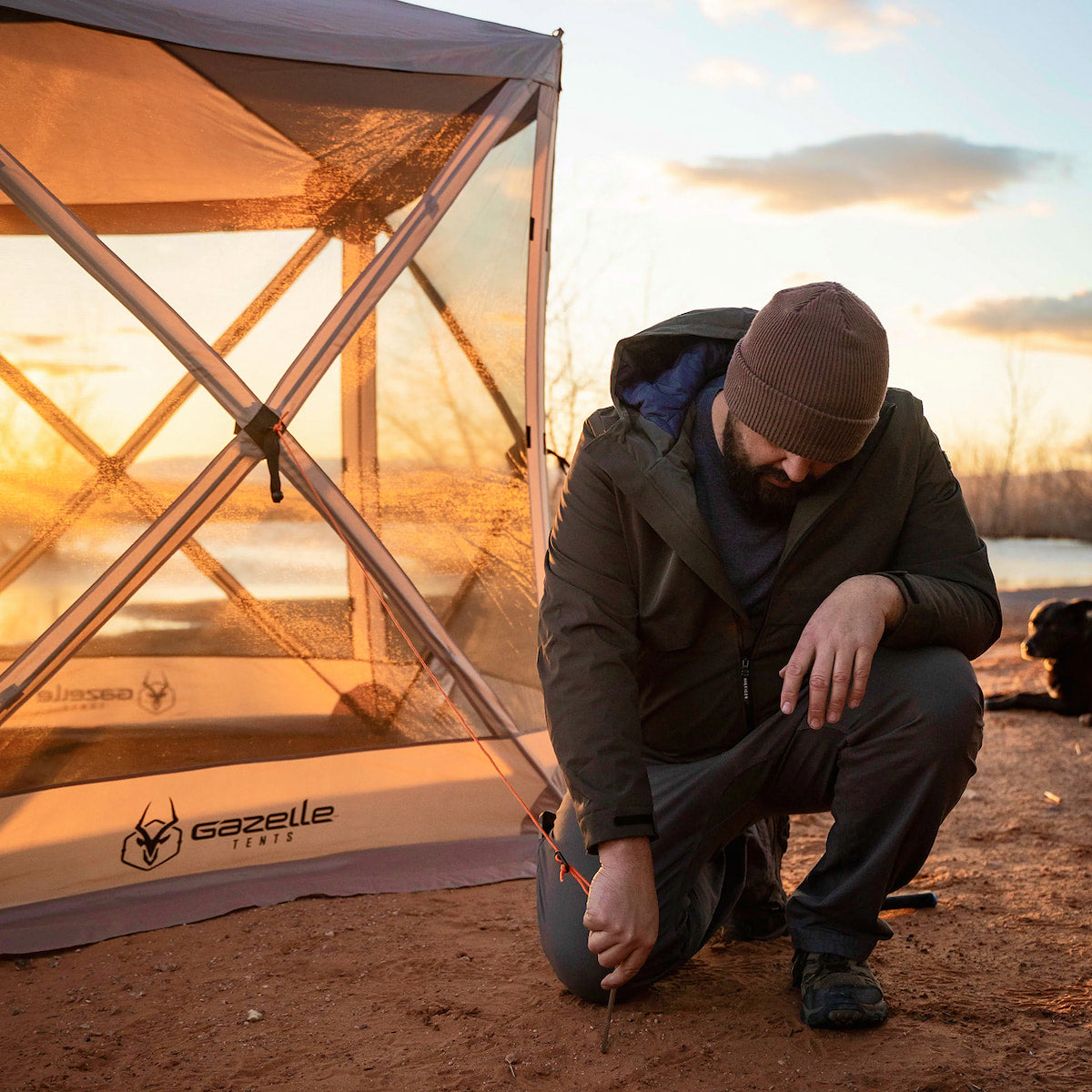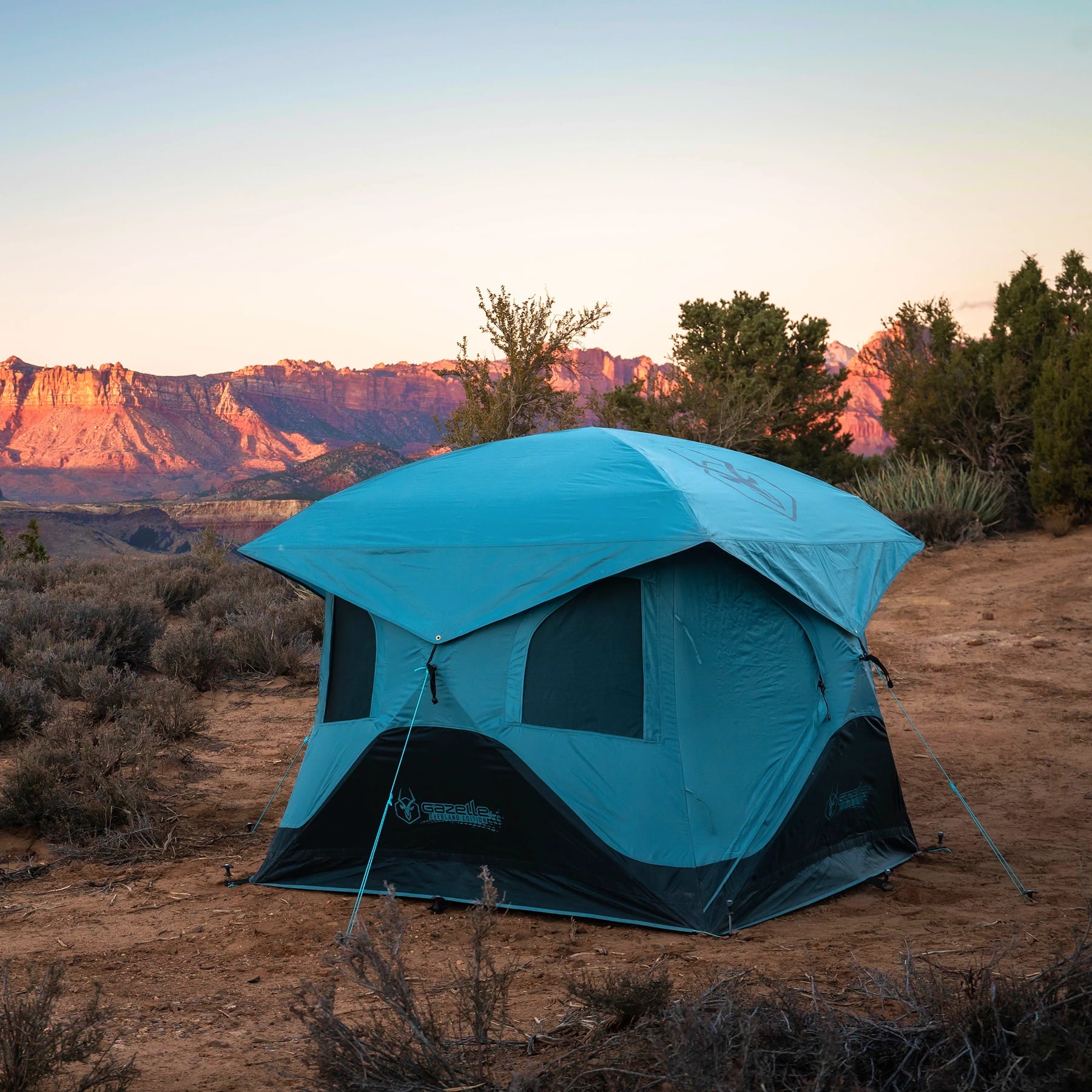 Gazelle Gazebos are portable and easy to set up, making them one of the most versatile shelters on the market. Whether you’re a car camper, RV enthusiast, or just hanging out in the backyard, Gazelle has you covered. Our Gazelle Tandem Gazebo gives you the space you need for your overlanding adventures while designed to collapse down to fit into your rig. The tandem design offers 93 sq. ft. of room for up to 10 people while collapsing down to 60” allowing it to fit into the back of a standard truck bed. With its unique hub design, the Tandem Gazebo is still easy to set up in under 60 seconds, with no assembly required. The Gazelle Tandem Gazebo is built with our exclusive TriTech mesh, a single filament mesh that features increased durability and improved airflow, without compromising the ability to keep even the smallest bugs out. The 210 denier Oxford weave polyester shell and roof material is waterproof up to a 2000MM HH rating and features a UV50+ rating protecting you from the sun and rain. The integrated wind panels provide privacy or protection from the wind and rain as needed. If weather permits and pests aren’t an issue enjoy the zippered windows on both the tight-weave mesh walls and wind panels for additional airflow. The front wind panel of the Tandem Gazebo can double as an awning for additional space to relax or store your gear. Included with your gazebo are Gazelle All-Terrain Stakes allowing you to stake down your gazebo in even the toughest terrain. Bring the Gazelle Tandem Gazebo on your next adventure.